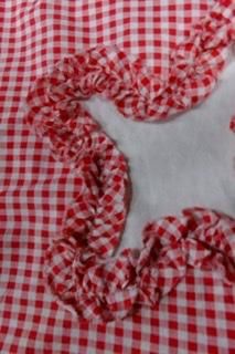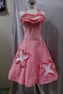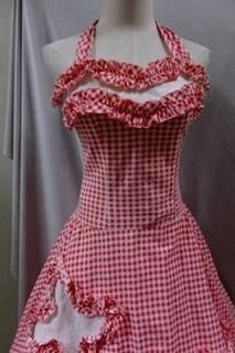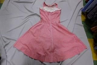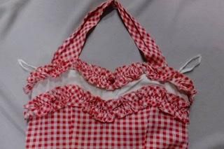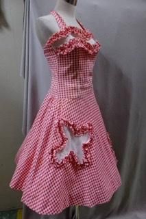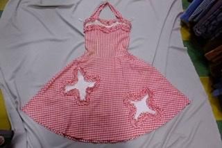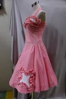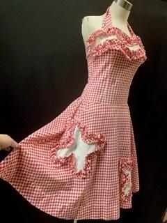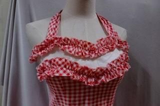 赤白のチェックで 胸の部分と スカートに 白い布が切替でついています。