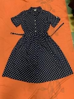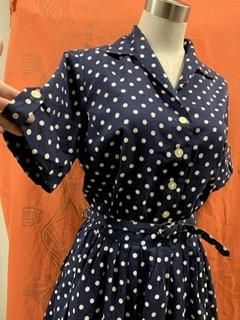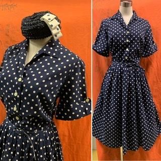 50s ベルトつき 紺白 ドット 水玉 シャツドレス ワンピース シャツワンピース ヴィンテージ 1950年代