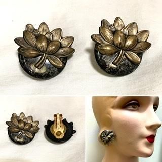 50s 蓮の花 イヤリング 蓮 はす ゴールド 黒 ヴィンテージ アクセサリー 1950年代 オリエンタル ハワイアン