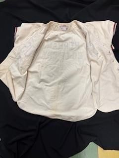 背中の文字の下あたりに、シュッとした青いシミがありますが、野球のユニフォームにしては